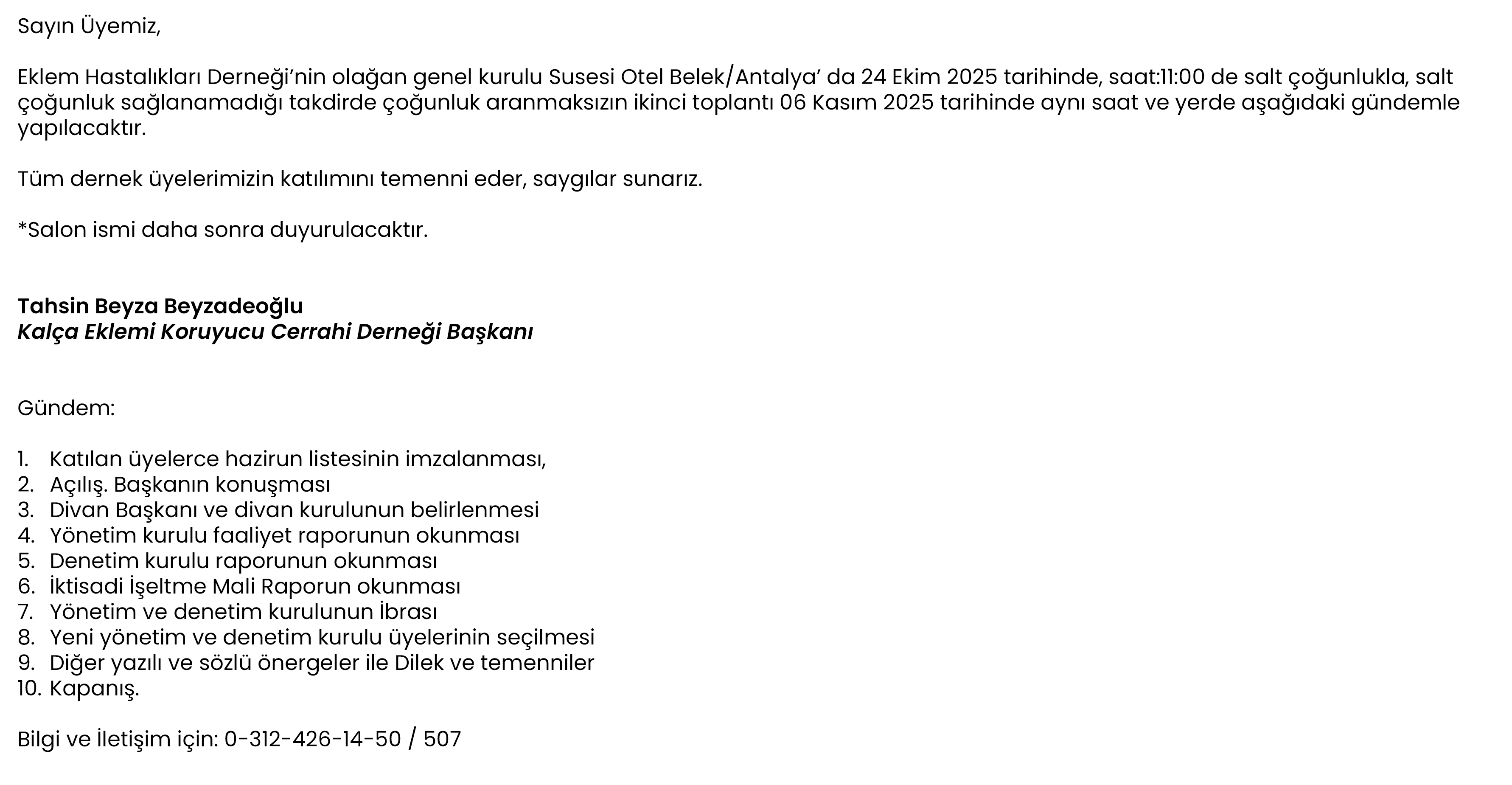 Eklem Hastalıkları Derneği,eklem hastalıklarının tanı ve tedavisi ile ilgilenen bilim insanlarını bir araya getirmek, bu konuda bilimsel toplantılar düzenleyip eğitim vermek ve eklem sağlığı konusunda toplumu bilgilendirmek amacıyla 2023 yılında kurulmuştur. Eklemleri ilgilendiren yaralanma ve hastalıkların, cerrahi ve cerrahi olmayan tedavileri ve rehabilitasyonu konularında bilimsel çalışmalar yapmakta, konu ile ilgilenen sağlık çalışanlarını bir araya getirerek bilgi ve deneyim paylaşımına katkıda bulunmaktadır. Ulusal ve uluslararası düzeyde saygın bilim insanları tarafından kurulan derneğin amacı, meslektaşlarımıza güncel ve bilimsel etkinliği kanıtlanmış tanı ve tedavi yöntemleri konularında teorik ve uygulamalı eğitimler vererek hastalarımızın tedavilerinin en iyi şekilde yapılmasına katkıda bulunmaktır.